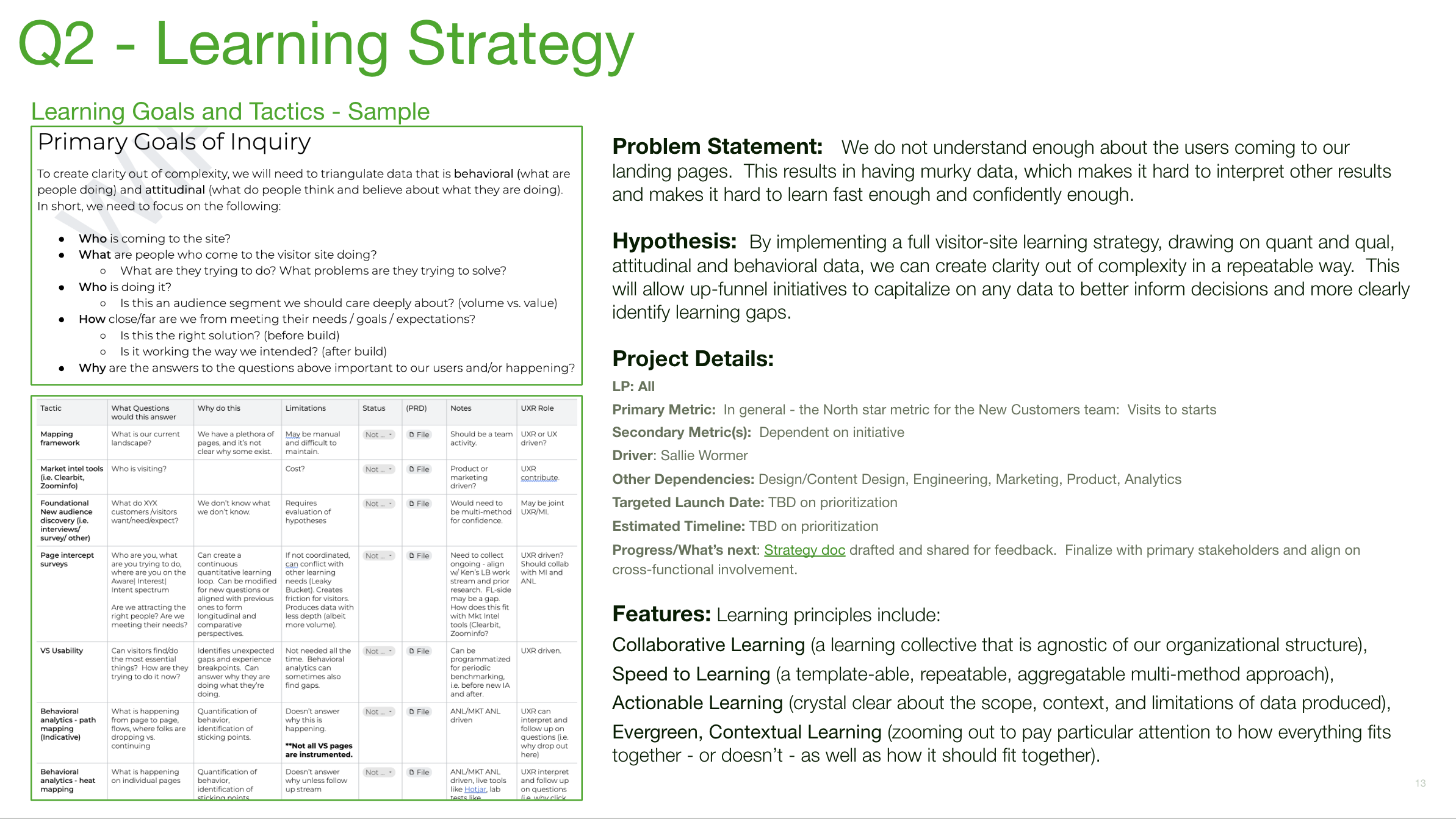 By helping product managers, designers and analysts focus on better-formed questions and redirecting their thinking from implementing learning tactics without questions (i.e. ‘we need heat mapping’), we created a scaffolded just-in-time learning strategy that unpacked who, what, why, and how well with a series of smaller studies. Some of these were designed to be left in place (intercept surveys), some were benchmarked by trusted vendors (usability by MeasuringU), and some were built to be reused by non-researchers (unmoderated concept evaluation and tree testing).