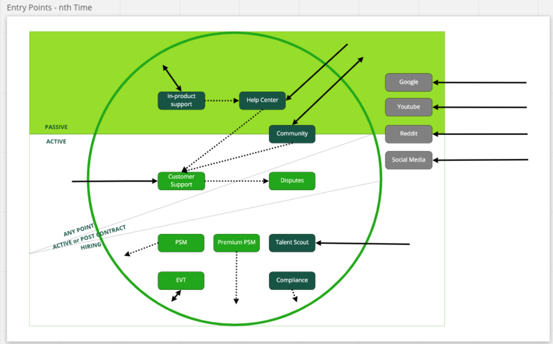 In addition to quantifying the drivers for needing human vs. self-service support via McFadden’s pseudo-R squared regression, existing and overlapping services were mapped for reference (shown here).